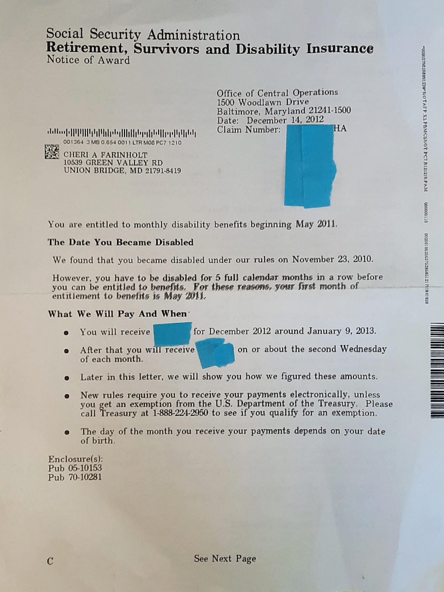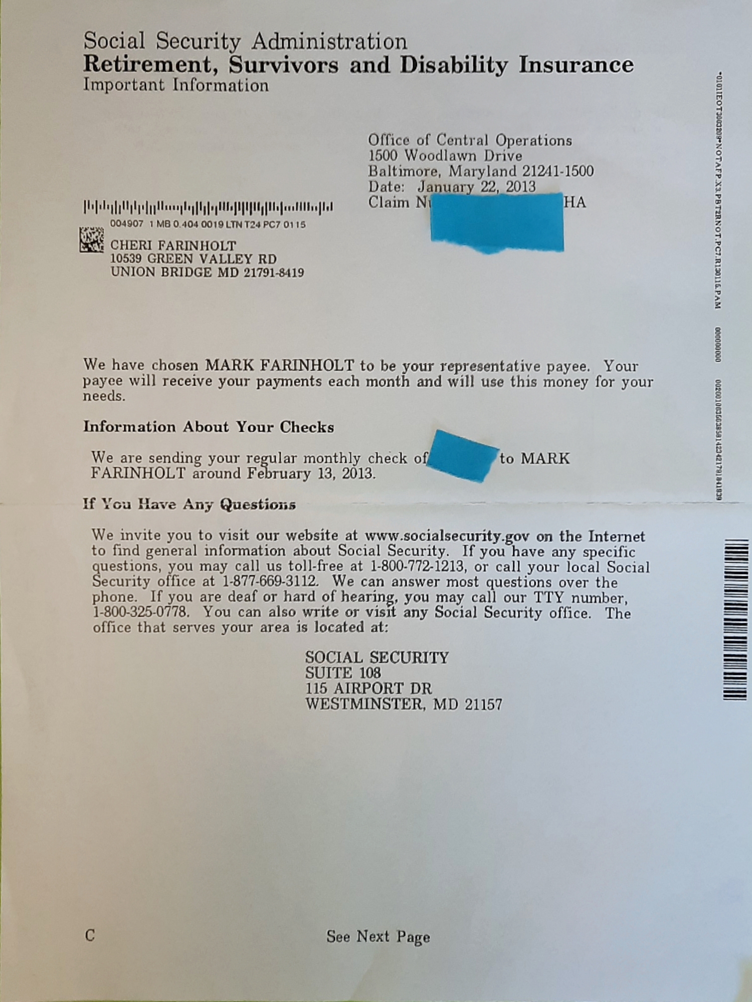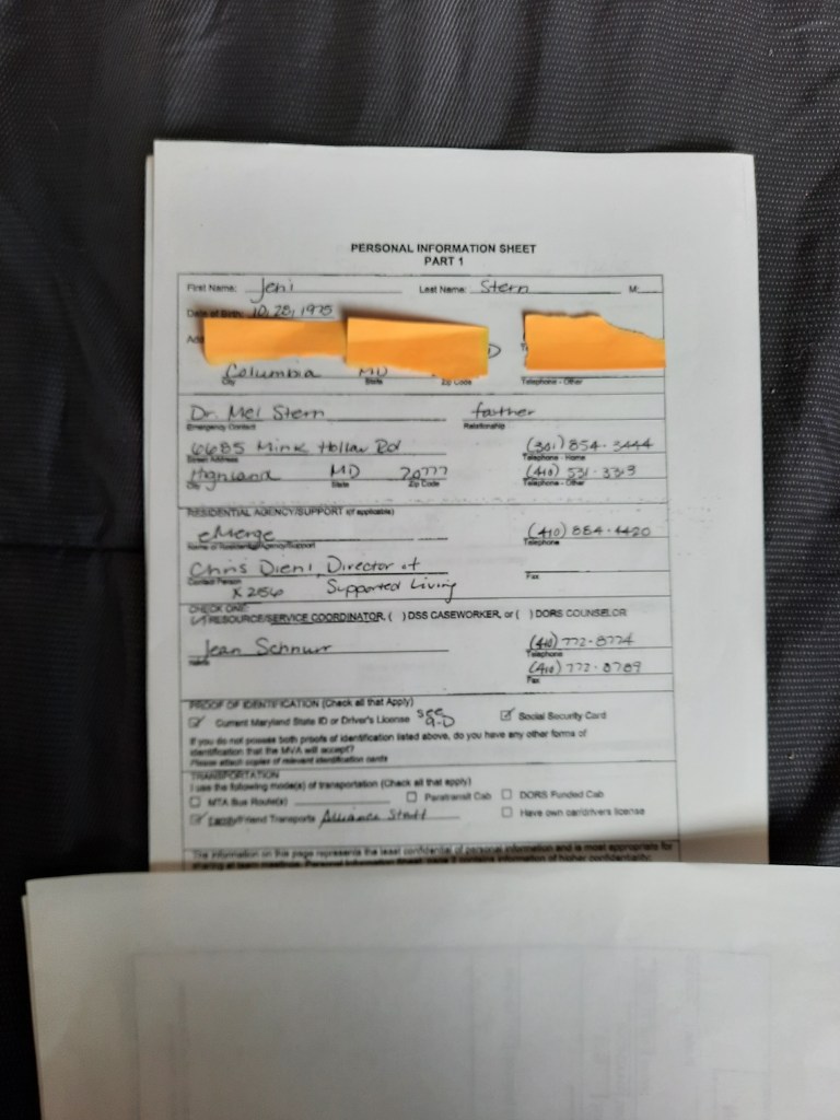 Finally, I explained that Jennifer Stern’s Social Security Disability claim was filed under a C1 status. Jennifer, would not know the correct claim number. Nore, would she have chosen my husband, Mark, to be her representative payee. I followed this up with documents that had been filed with Howard County Courts, and Emerge in Columbia, Maryland. An agency that provides adults with disabilities, support services to live independently.