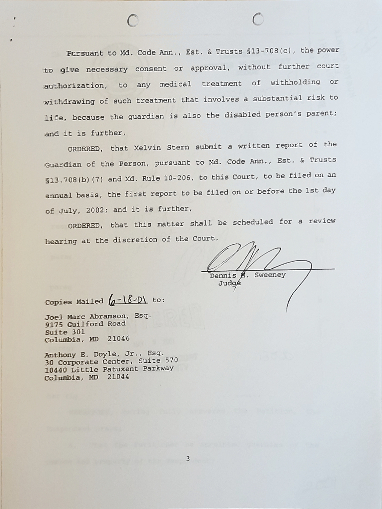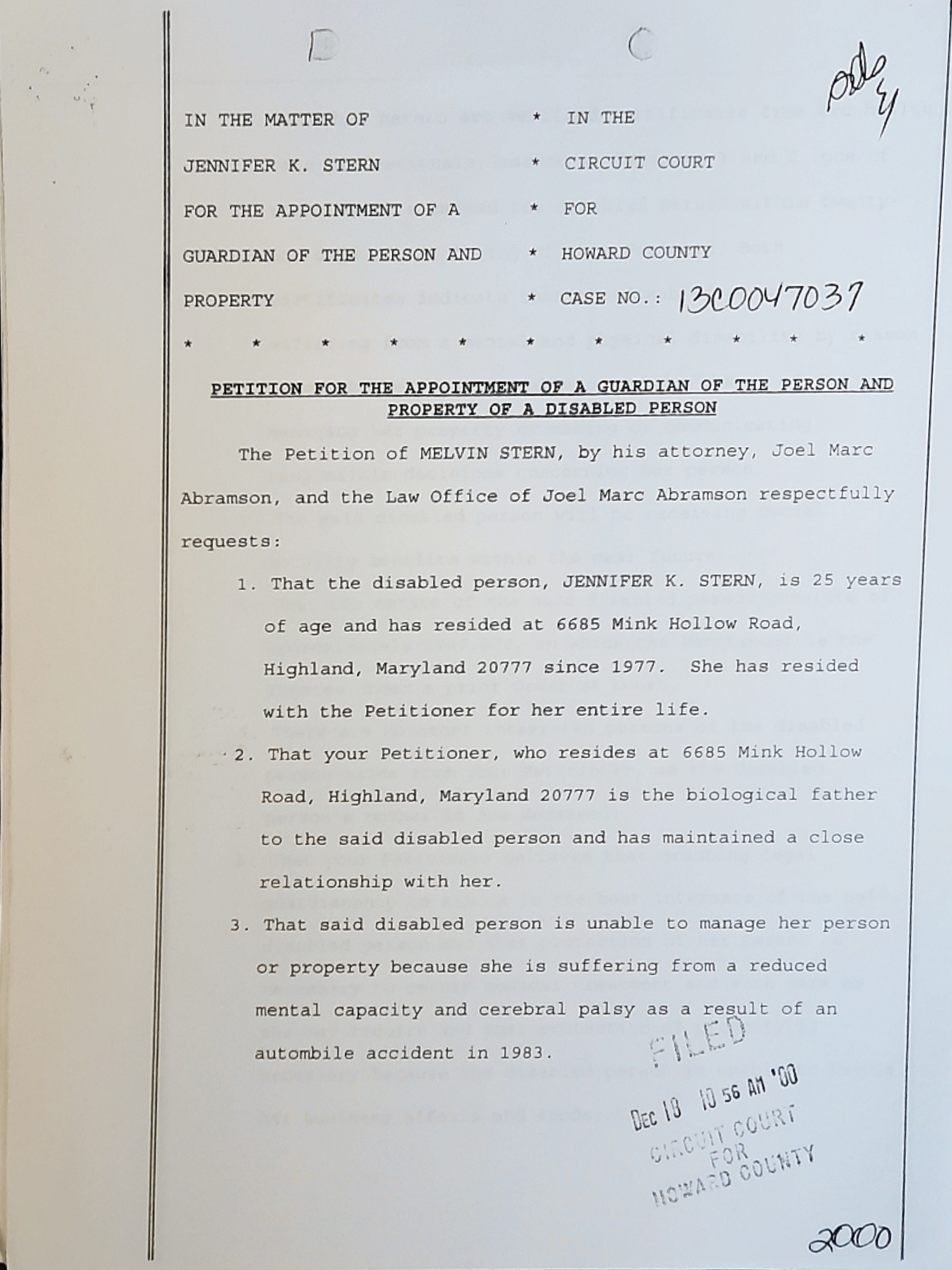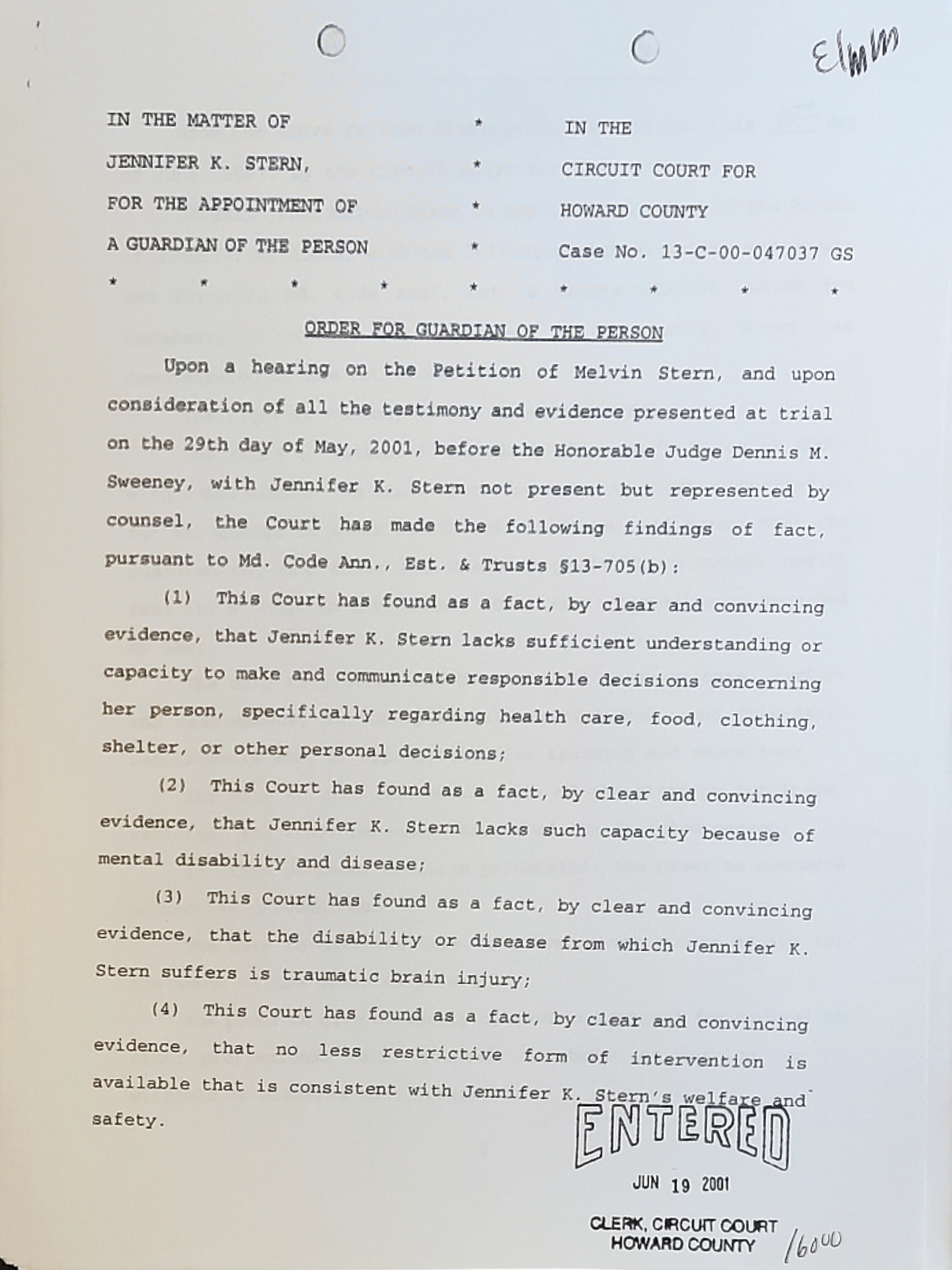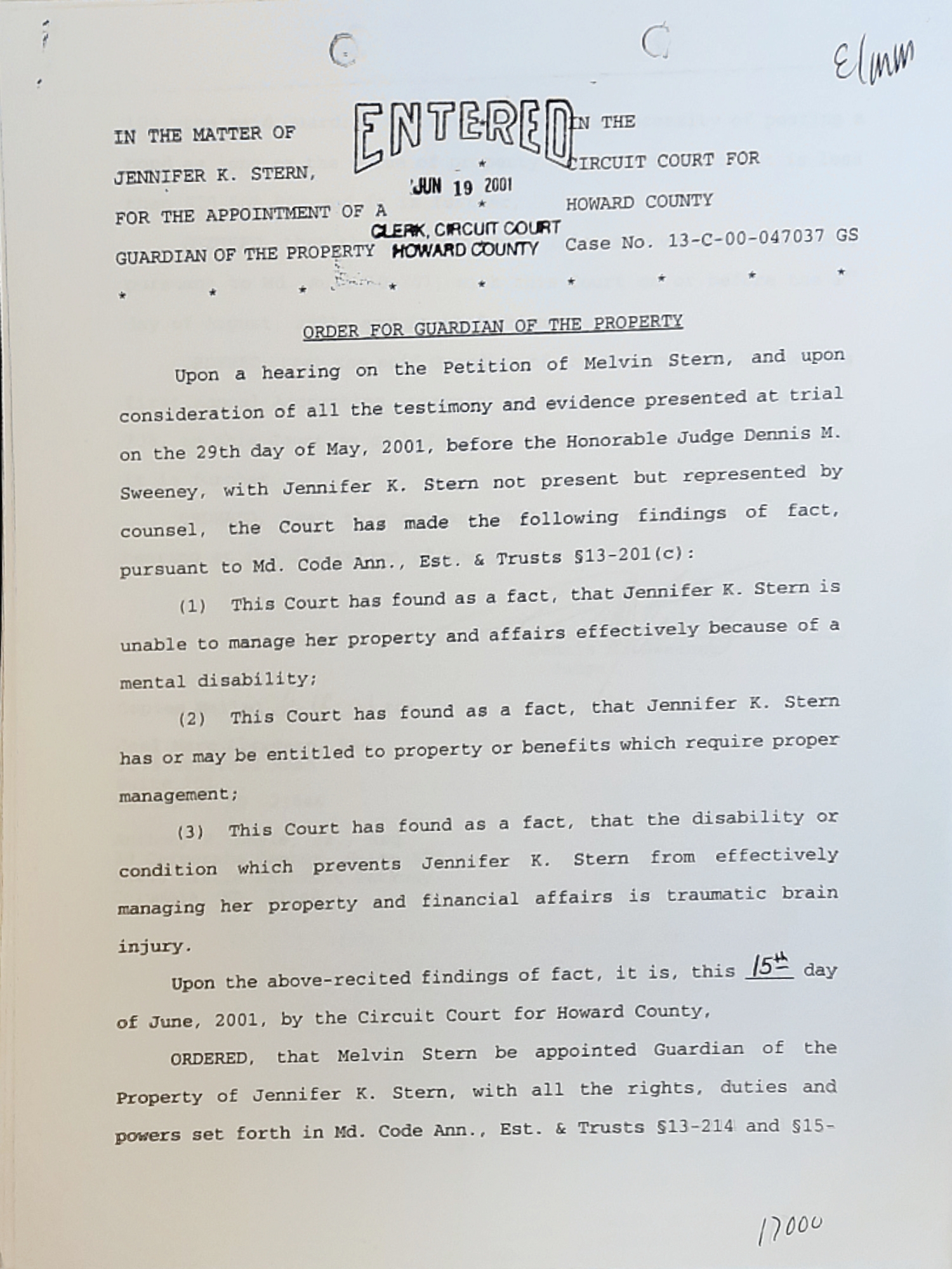On June 19, 2001 Honorable Judge Dennis M. Sweeney, granted Melvin S. Stern sole guardian of Person and Property of Jennifer Kay Stern.